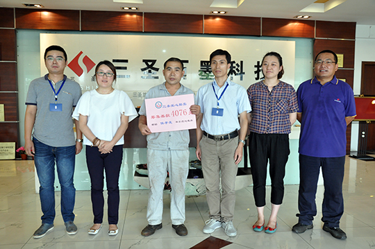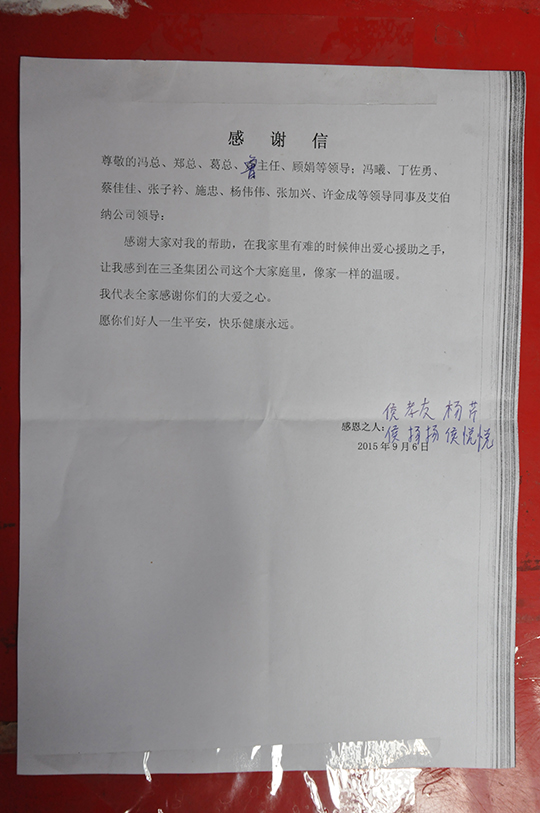 四、 董事長親自捐贈善款救助聽到侯孝友的實際困難匯報后,董事長非常關(guān)心,立即拿出私人款2000元現(xiàn)金資助,幫助侯孝友度過暫時的難關(guān)。鄭董還親自接待了侯孝友,詳細了解了他家庭目前的狀況,鼓勵他樹立信心,克服暫時困難,及時幫助妻子治療,引導兒女安心學習,同時,希望他在公司本職工作中繼續(xù)發(fā)揚不拍苦、腳踏實地的精神,積極專研技能,不要辜負三圣愛心傳遞的希望。
