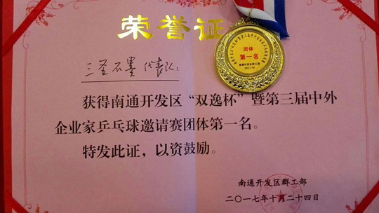 10月24日,三圣石墨代表隊(duì)參加南通開發(fā)區(qū)“雙逸杯”暨第三屆中外企業(yè)家乒乓球邀請(qǐng)賽,通過(guò)一天的緊張角逐,過(guò)關(guān)斬將,最終在24支代表隊(duì)中脫穎而出,獲得本次比賽冠軍。