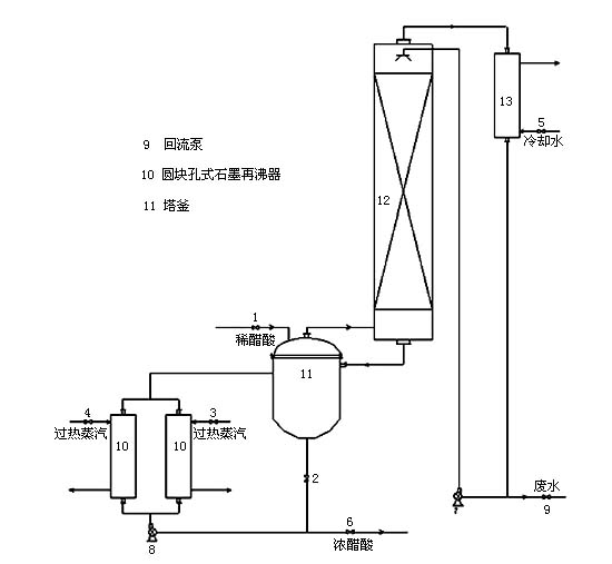 本系統(tǒng)采用先進(jìn)設(shè)計(jì)理念,將生產(chǎn)過程產(chǎn)生的15%-25%的稀醋酸濃縮到99%,在此過程中使排放的廢水達(dá)到環(huán)保標(biāo)準(zhǔn)。系統(tǒng)主體設(shè)備-石墨精餾塔,采用聚四氟乙烯浸漬石墨新型材料制造,整個(gè)系統(tǒng)具有工藝先進(jìn),操作簡便,運(yùn)行費(fèi)用少,使用年限長的特點(diǎn),目前,該系統(tǒng)已在浙江龍盛集團(tuán)、浙江閏土集團(tuán)成功運(yùn)行。